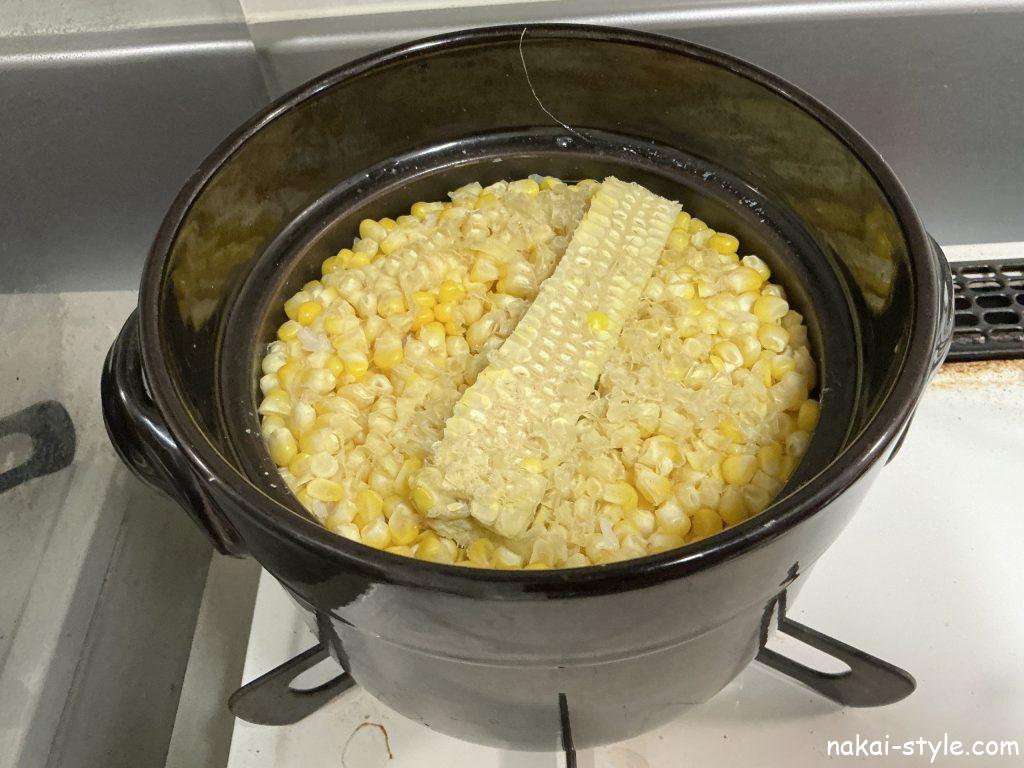 そんな訳でとうもろこしご飯食べたくなって、作りました🥰 普段はご飯あまり🍚食べないので炊飯器持ってないんです。けどご飯用の土鍋を持ってるので土鍋くんに登場してもらいました❣️
