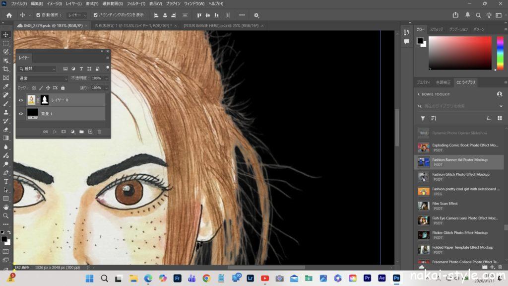 最近のphotoshopはマスクが細かいところまでマスクしてくれるようになったのはありがたいですね❤️🔥0.05mmのライナーペンで描いた線も拾ってくれてます😱